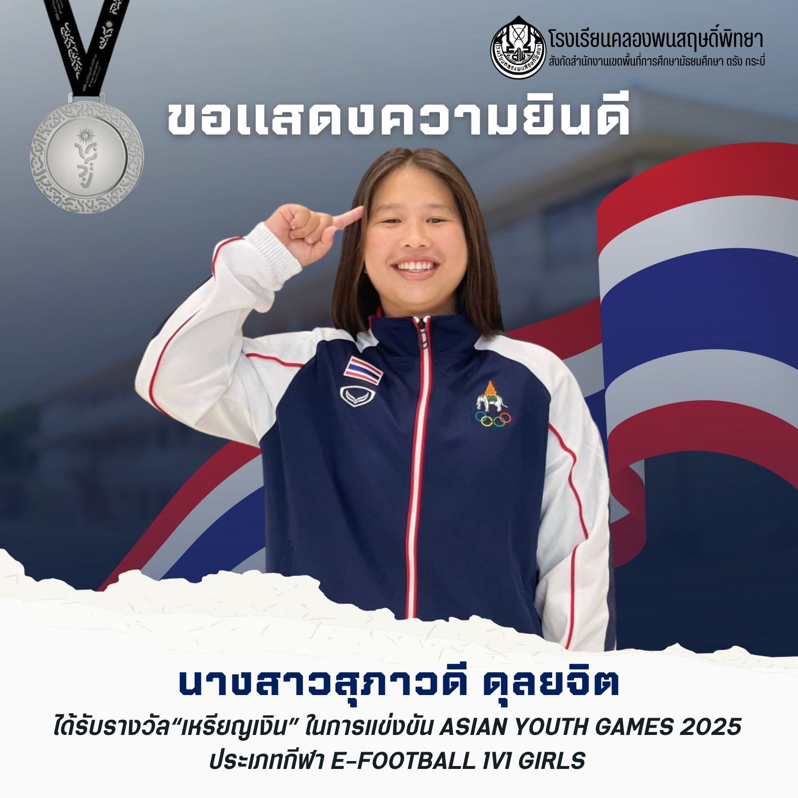 ขอขอบคุณคุณพ่อคุณแม่ คณะครู และชาวจังหวัดกระบี่ทุกท่าน ที่ได้ร่วมส่งแรงใจ แรงเชียร์ และแรงสนับสนุนให้เธอก้าวสู่ความสำเร็จในครั้งนี้อย่างภาคภูมิ