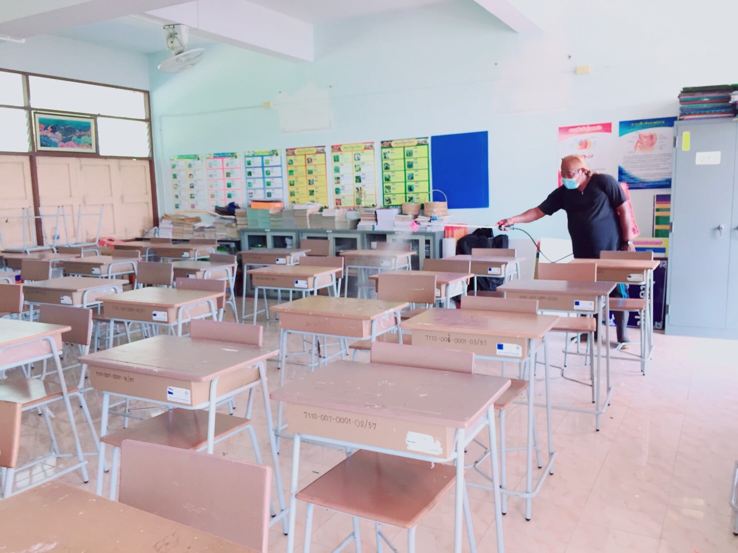 เจ้าหน้าที่จากเทศบาลตำบลคลองพน มาฉีดพ่นยาฆ่าเชื้อไวรัสโควิด-19 ให้กับทางโรงเรียนคลองพนสฤษดิ์พิทยา