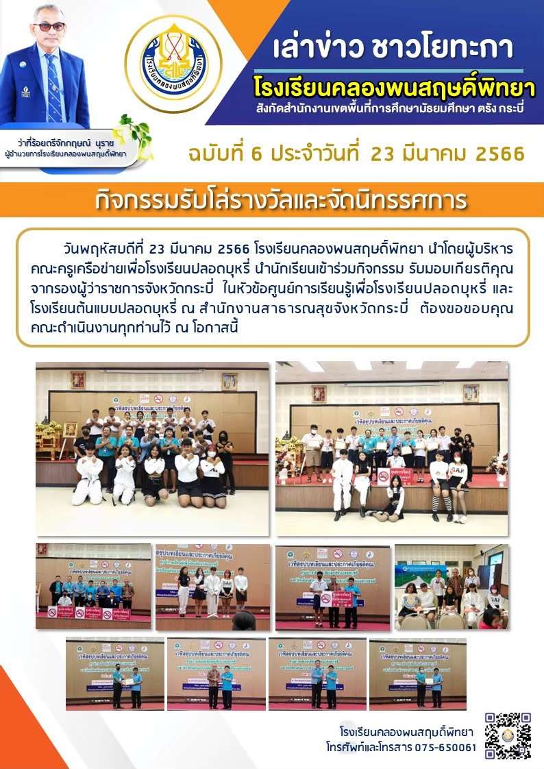 เข้าร่วมกิจกรรม รับมอบเกียรติคุณ จากรองผู้ว่าราชการจังหวัดกระบี่ ในหัวข้อศูนย์การเรียนรู้เพื่อโรงเรียนปลอดบุหรี่